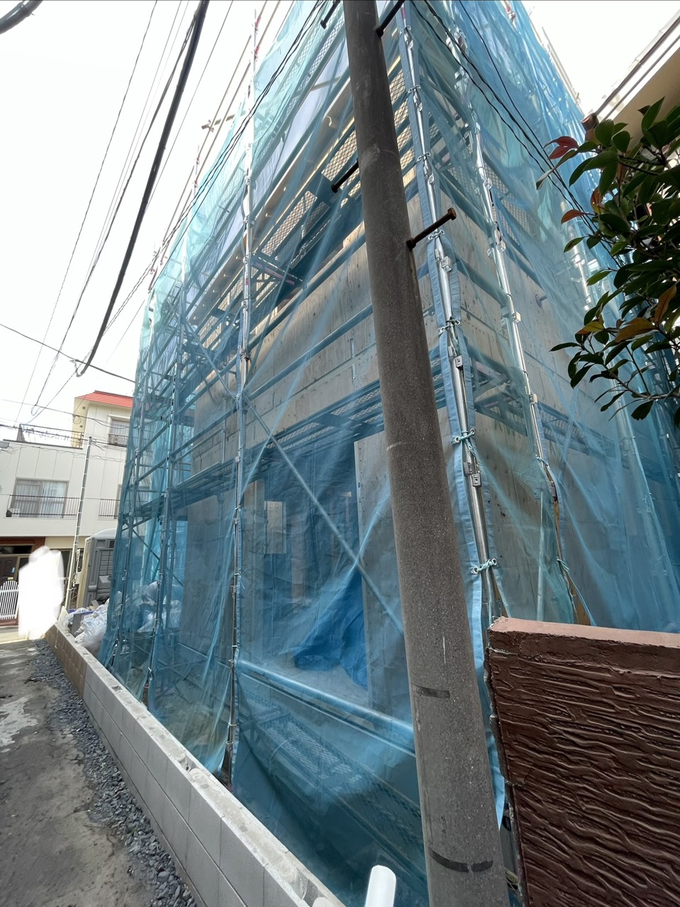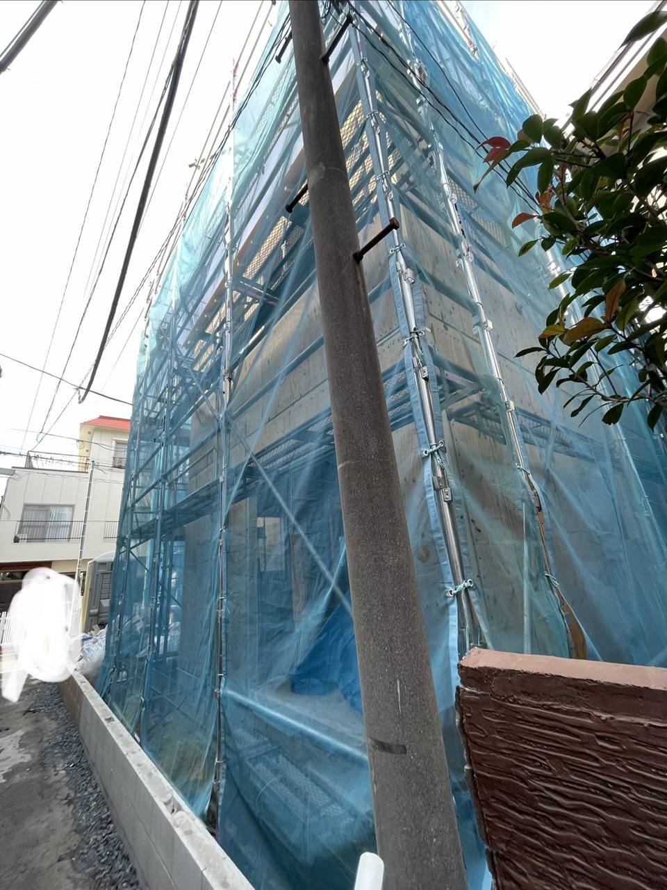 空を覆う青いシートが、期待感を高める建築現場