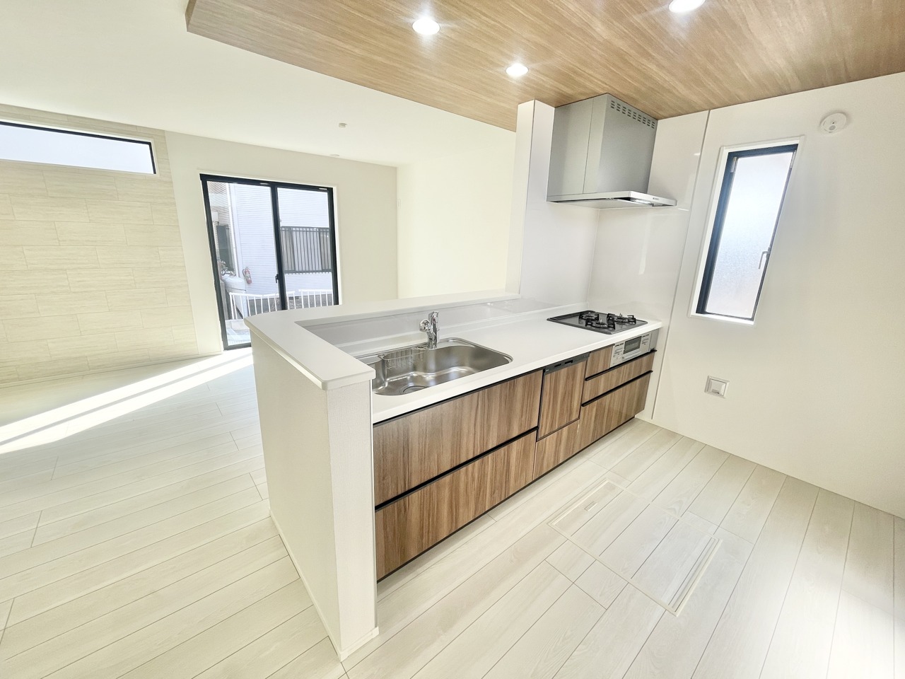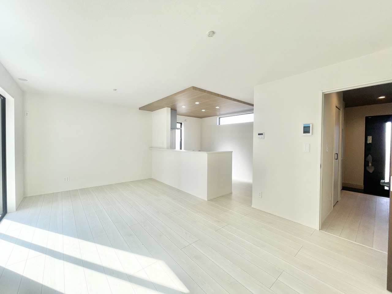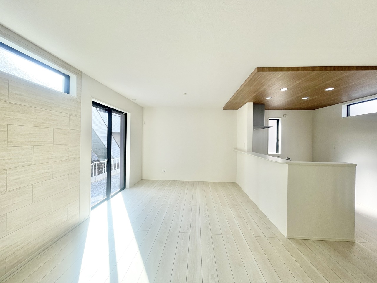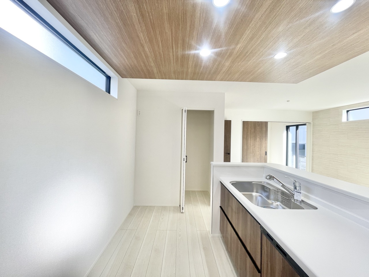 木目調の天井が空間に温かみを添える、心地よい広がりを感じる住まい。