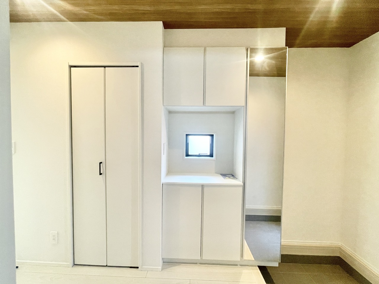 白く清らかな空間に、柔らかな木目の扉がアクセントを添える。