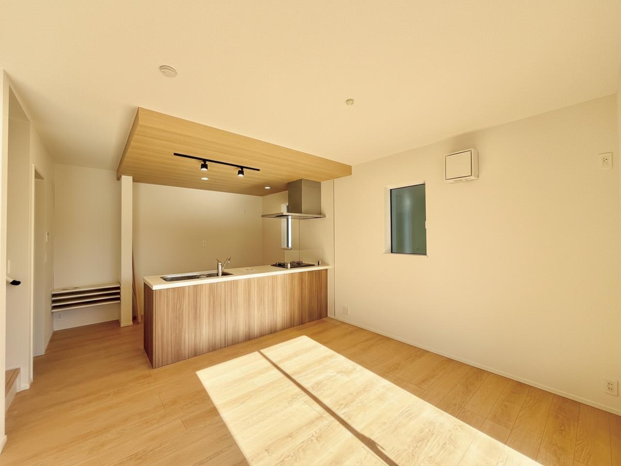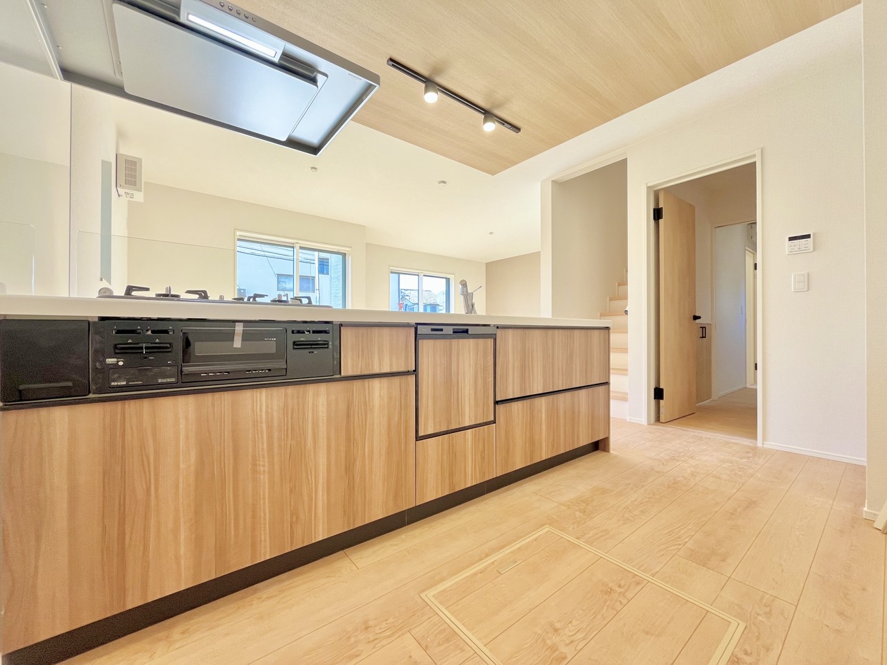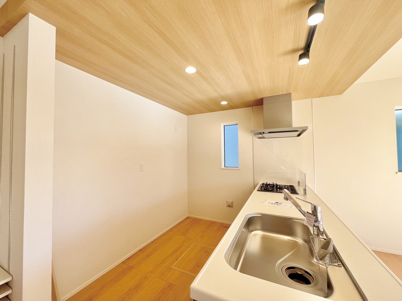 リビングにいる家族の顔が見渡せるカウンターキッチン。お料理もより一層おいしく、楽しく。食器棚を背面に設置しても十分な広さを確保しています。