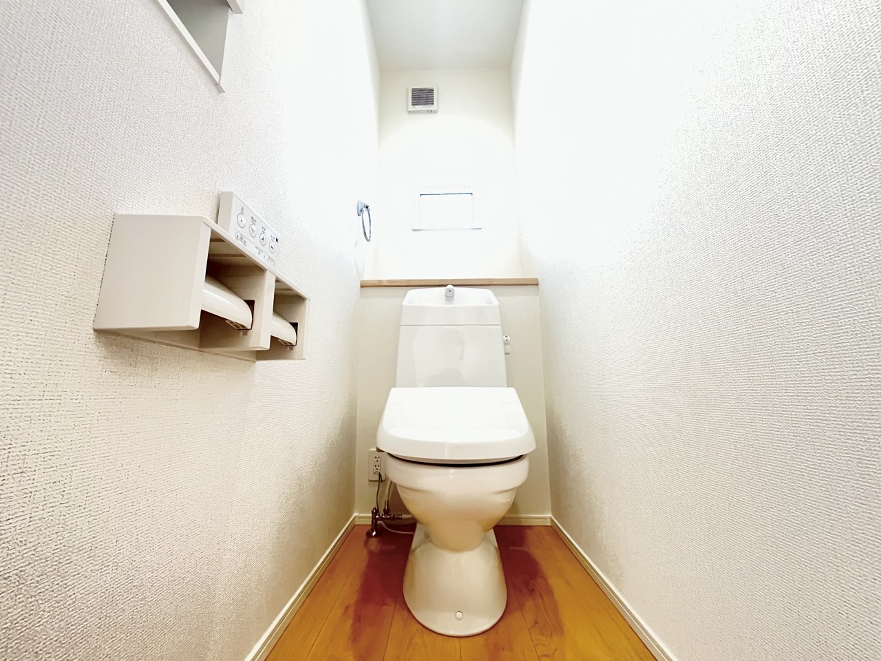 ウォシュレット機能付きのトイレ。収納もあり実用性も兼ね備えた造り。