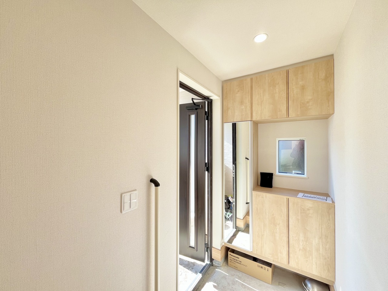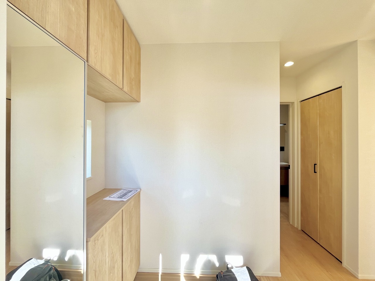 お宅の顔となる明るく開放的な玄関。ご家族皆様様の靴を収納できるスペースと全身鏡があり、お出掛け前に身だしなみチェックもできます。