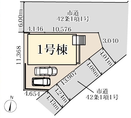 | 接道 | 北側6M公道に14.7M接道 南東側4.08M公道に13.9M接道 |