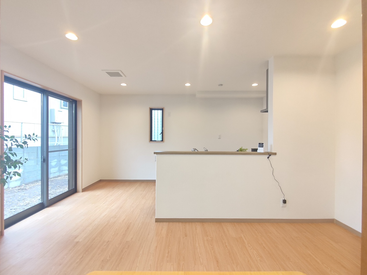 家族や友人、両親、親戚とこれから沢山の時間を紡ぐのだろう。 そこを彩るのは窓から見える青い空、心地よい緑。そんなイメージが膨らむリビングスペース。