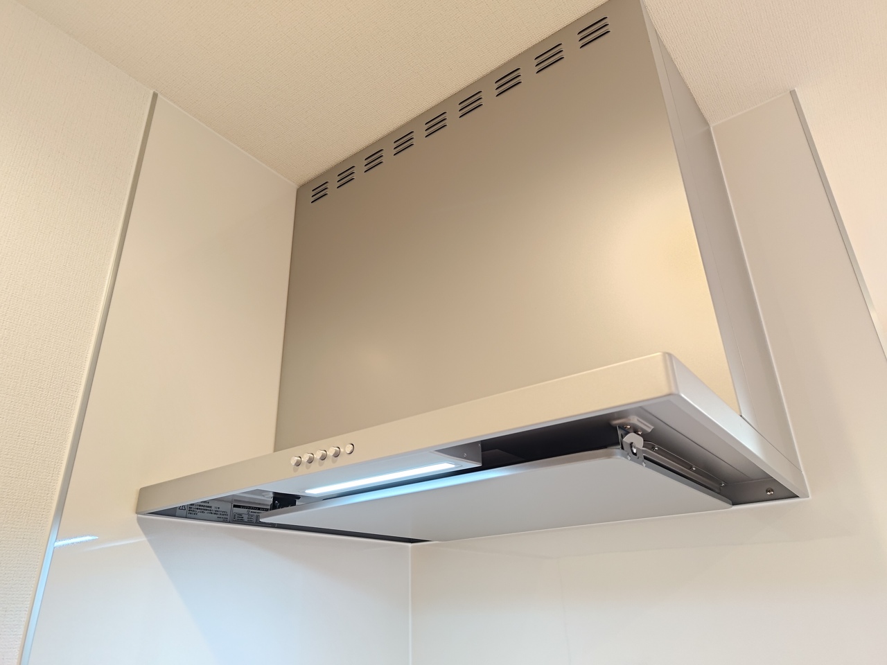 スマートな見た目のレンジフード。 場合に応じて換気速度が調節できます。