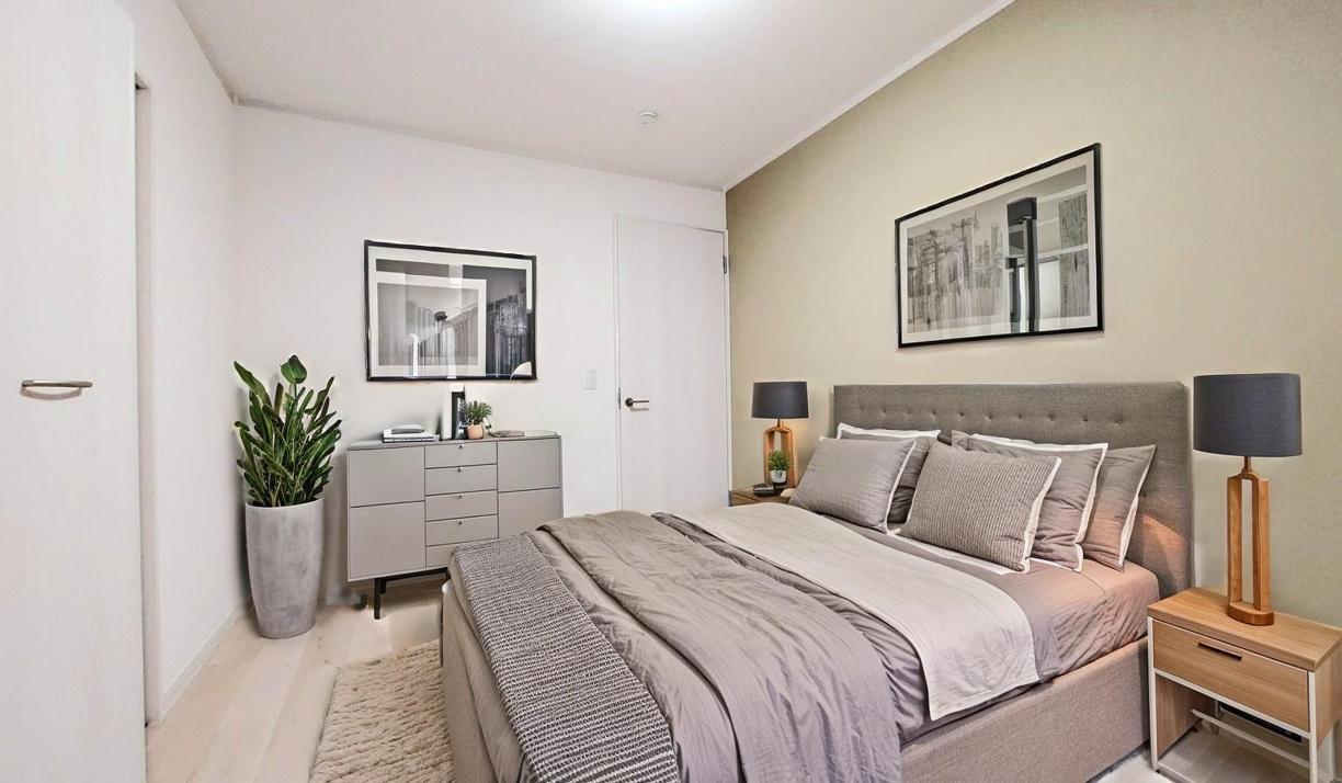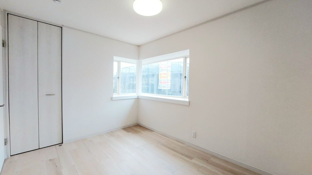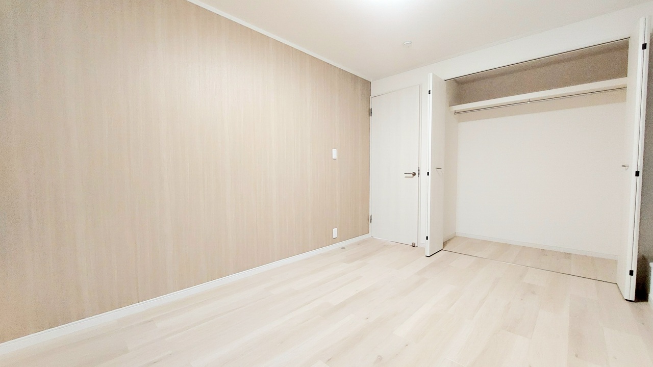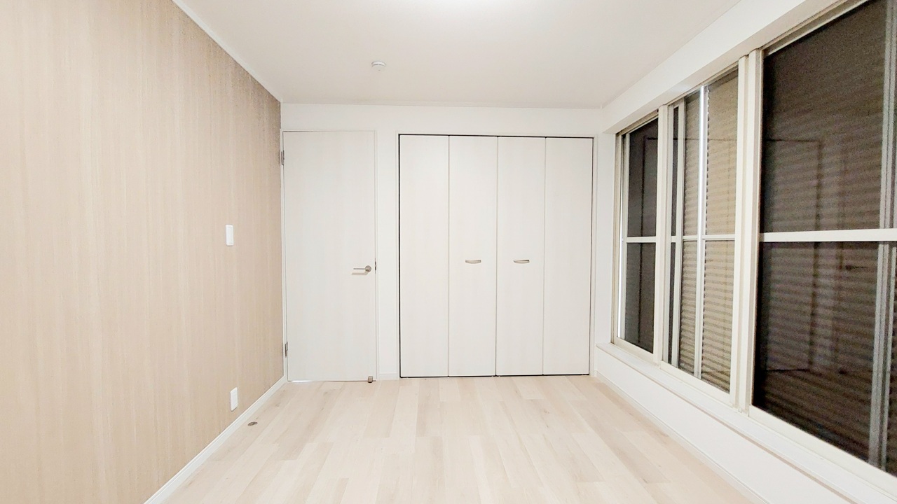 アクセントクロスを使用したオシャレな洋室。窓からそそぐ陽の光が眩しいベッドルームは、朝の目覚めが心地良く迎えられそうです。