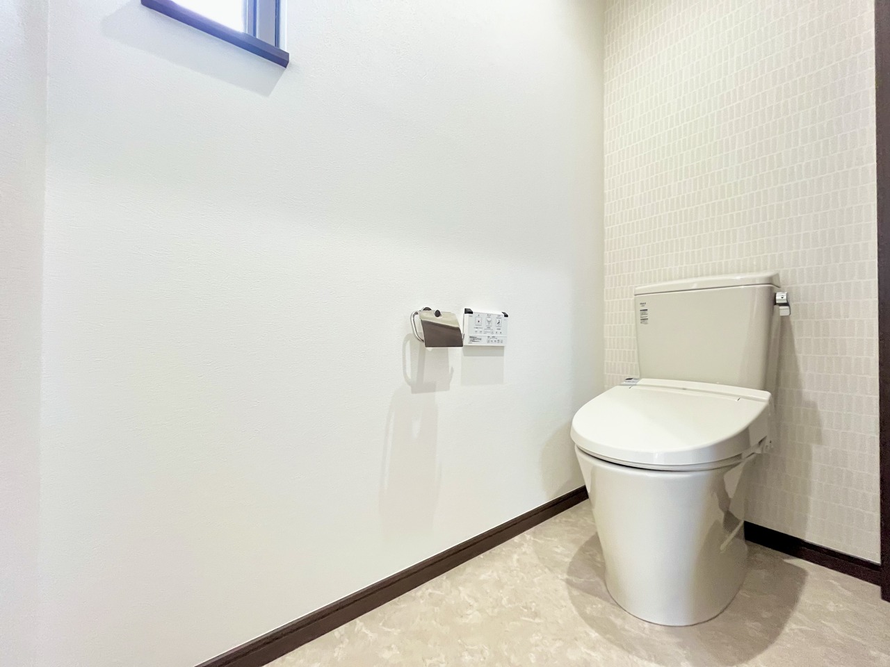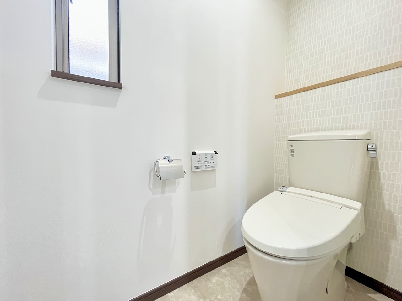 ウォシュレット機能付きのトイレ。換気のしやすい窓付きで、収納もあり実用性も兼ね備えた造り。