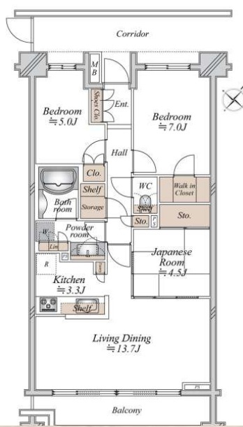 | 間取 | 3LDK+WIC (LDK13.7帖、和室4.5帖、洋室5.0帖、洋室7.0帖) | ||