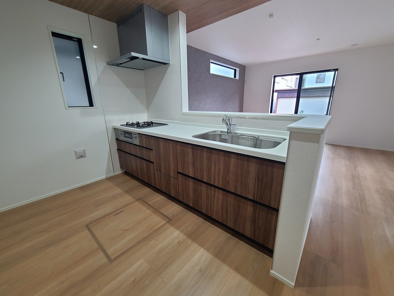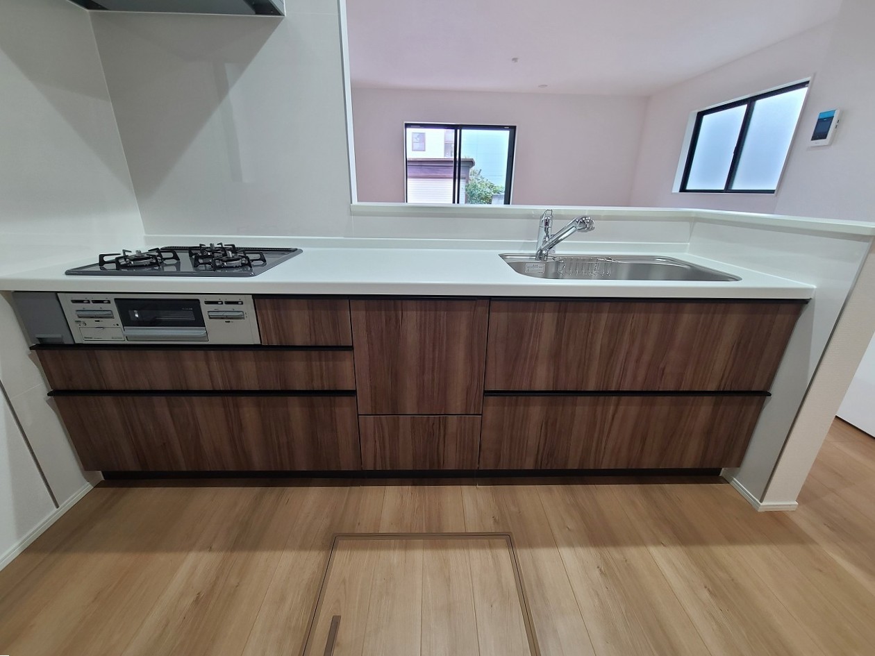 リビングにいる家族の顔が見渡せるカウンターキッチン。お料理もより一層おいしく、楽しく。食器棚を背面に設置しても十分な広さを確保しています。