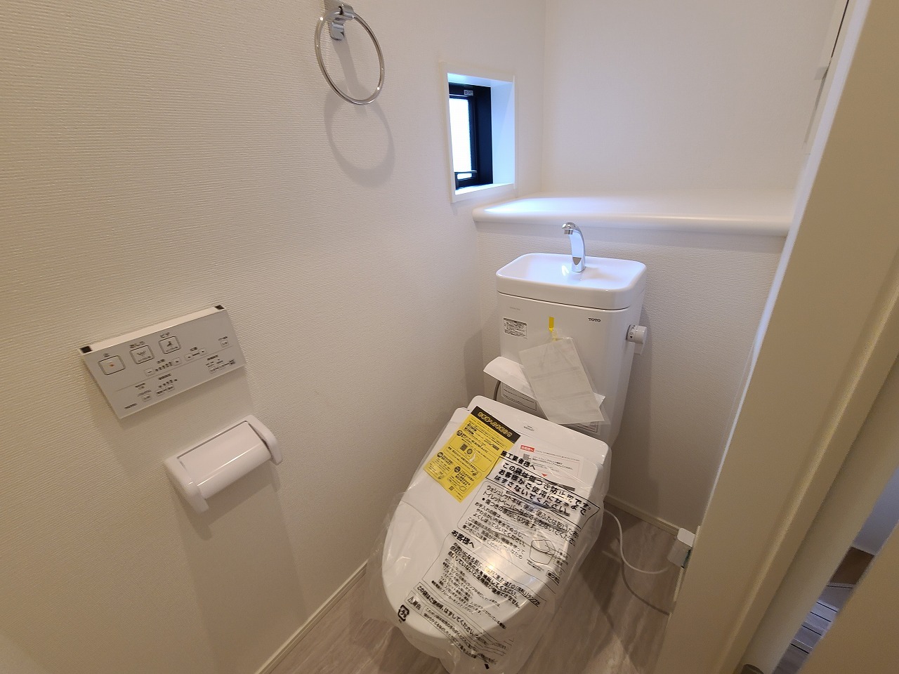 ウォシュレット機能付きのトイレ。換気のしやすい窓付きで、収納もあり実用性も兼ね備えた造り。