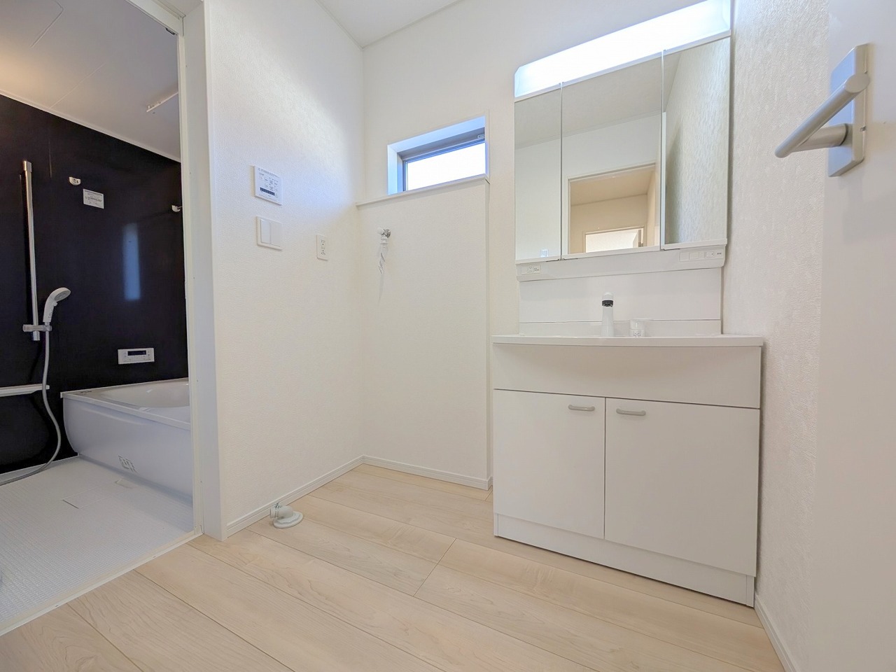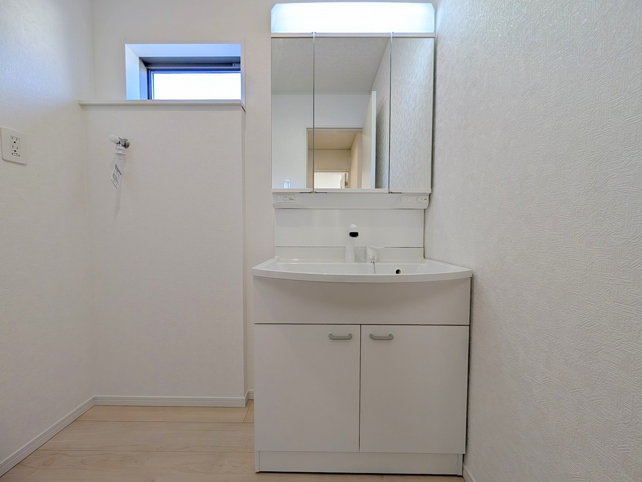 収納豊富な三面鏡付洗面化粧台。水回りのあれこれがキレイに収まりそうですね。