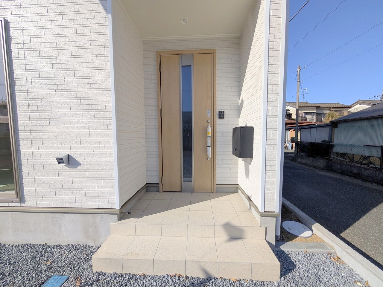 ポーチのついた新築分譲物件。玄関の印象はいかがでしょうか?入口からご覧ください。