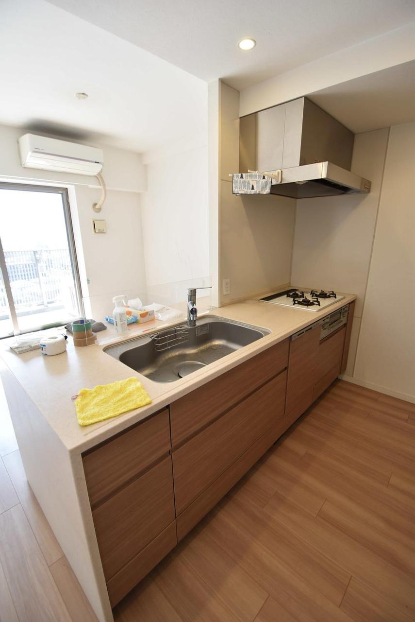 リビングにいる家族の顔が見渡せるカウンターキッチン。お料理もより一層おいしく、楽しく。食器棚を背面に設置しても十分な広さを確保しています。