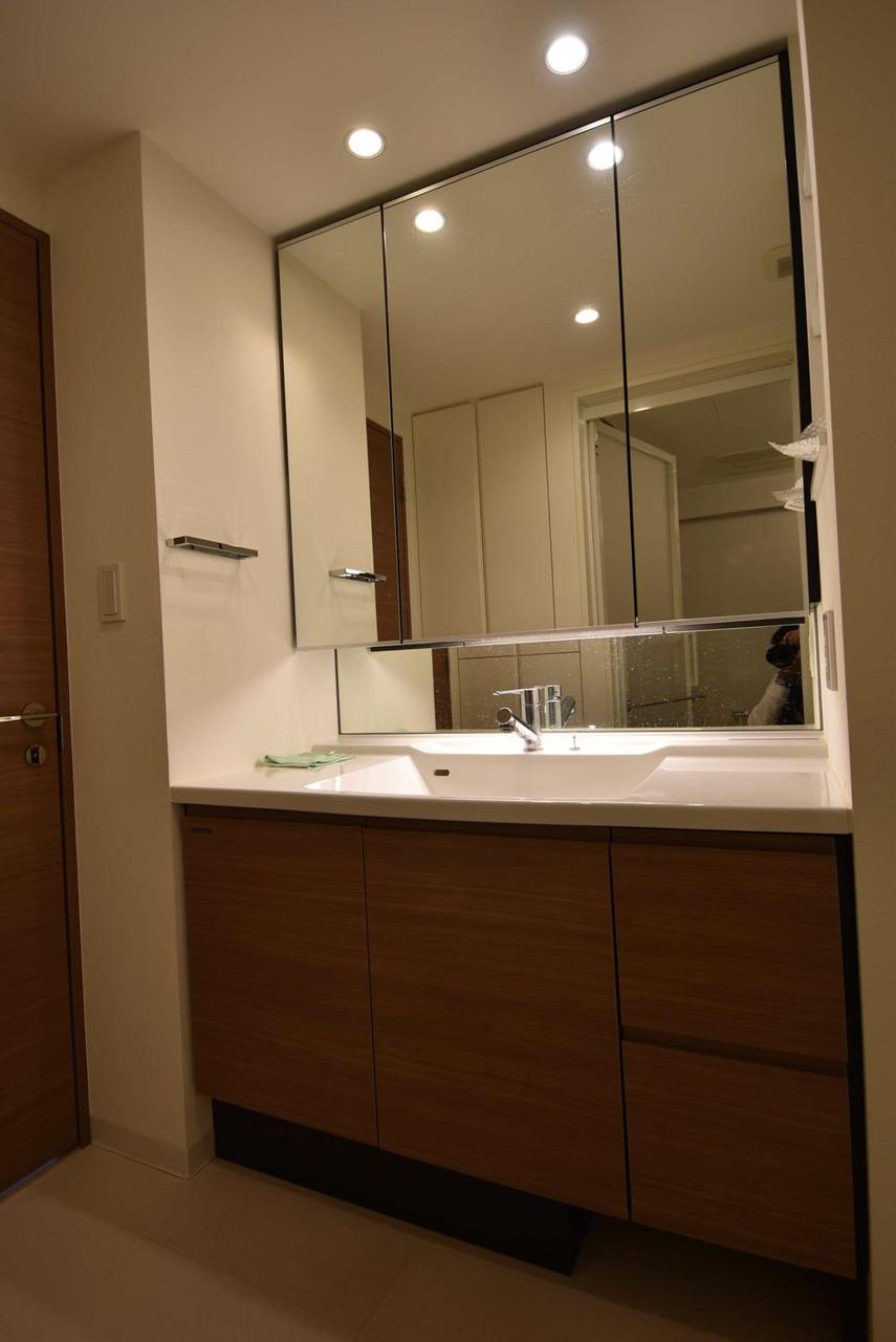 お出かけ前の身だしなみに一歩差がつく三面鏡。ミラー裏にはたっぷり収納もございます。