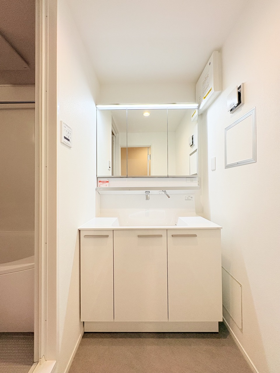 洗面化粧台は清潔感の漂うホワイトをベースカラーに、シンプルなデザインで。