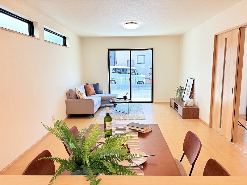 18.5帖の明るく開放的なLDKが特徴のA号棟です。