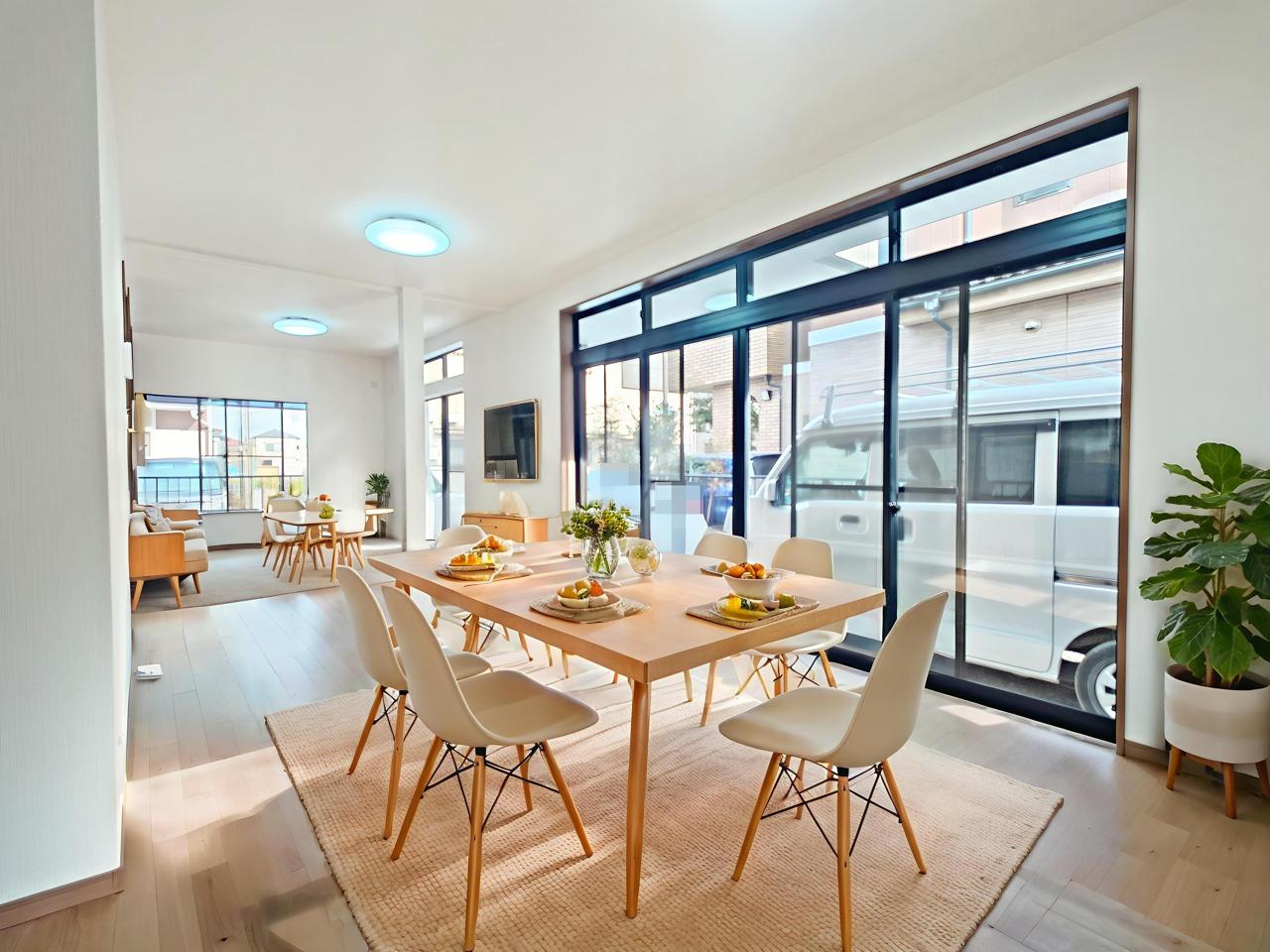 家族団欒のリビング。陽光差し込む食卓には家族の会話とスマイルが溢れます。いつまでもここで食卓を囲みたくなる、そう感じさせてくれるスペース。