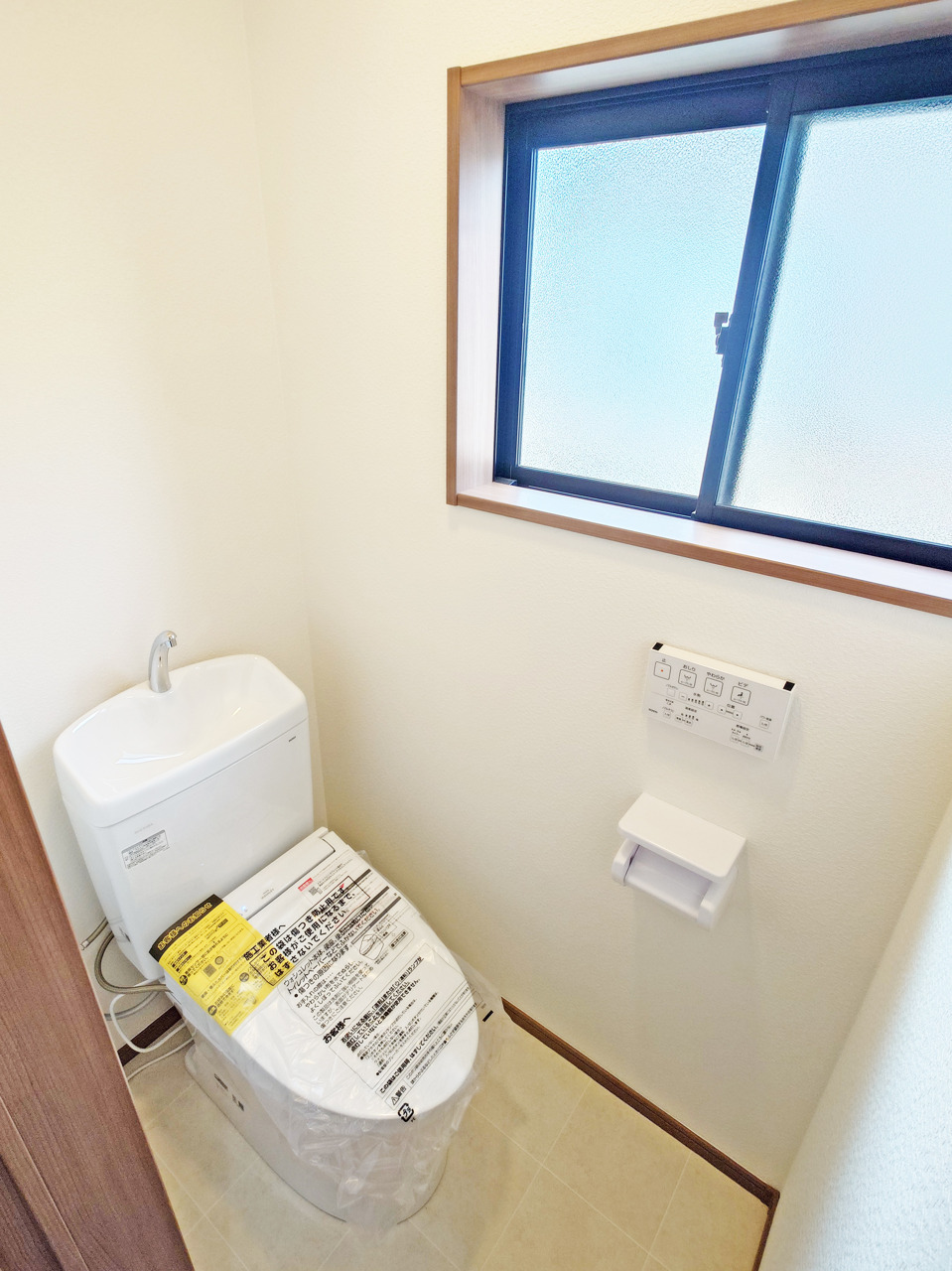 ウォシュレット機能付きのトイレ。換気のしやすい窓付きで、収納もあり実用性も兼ね備えた造り。