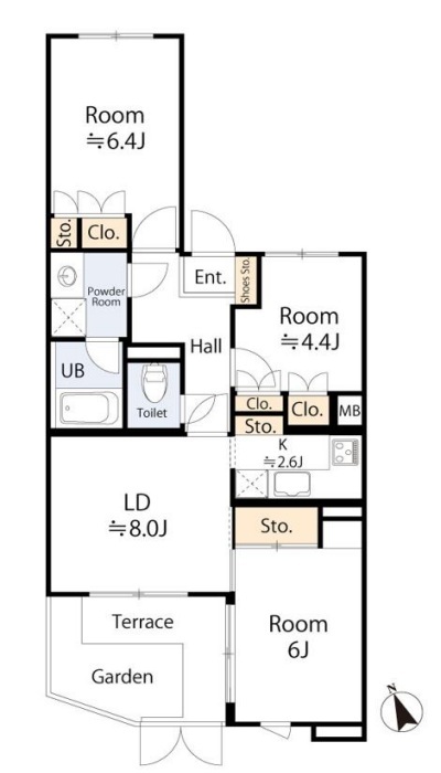 | 間取 | 3LDK (LD8.0帖、K2.6帖、洋室6.4帖、洋室6帖、洋室4.4帖) | ||