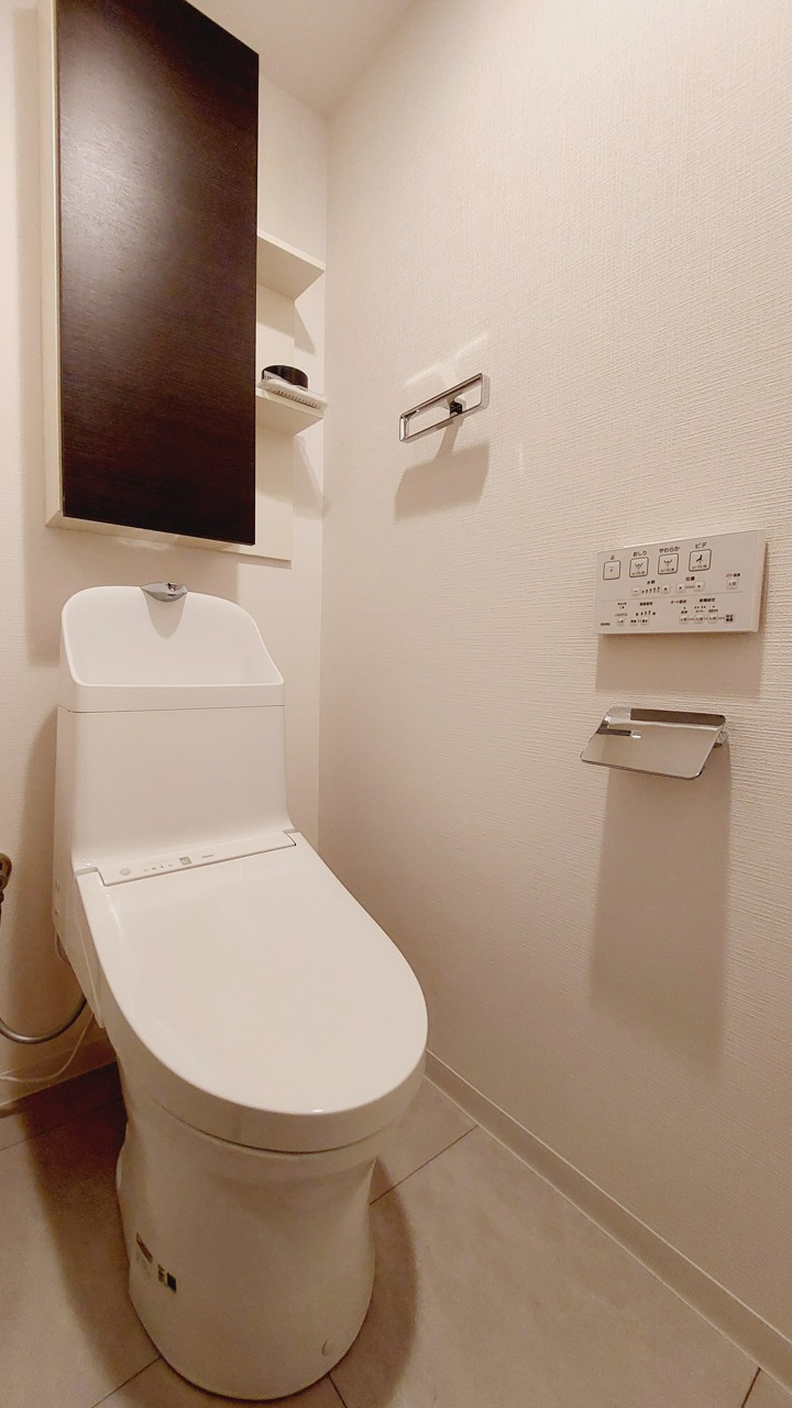ウォシュレット機能付きのトイレ。収納もあり実用性も兼ね備えた造り。