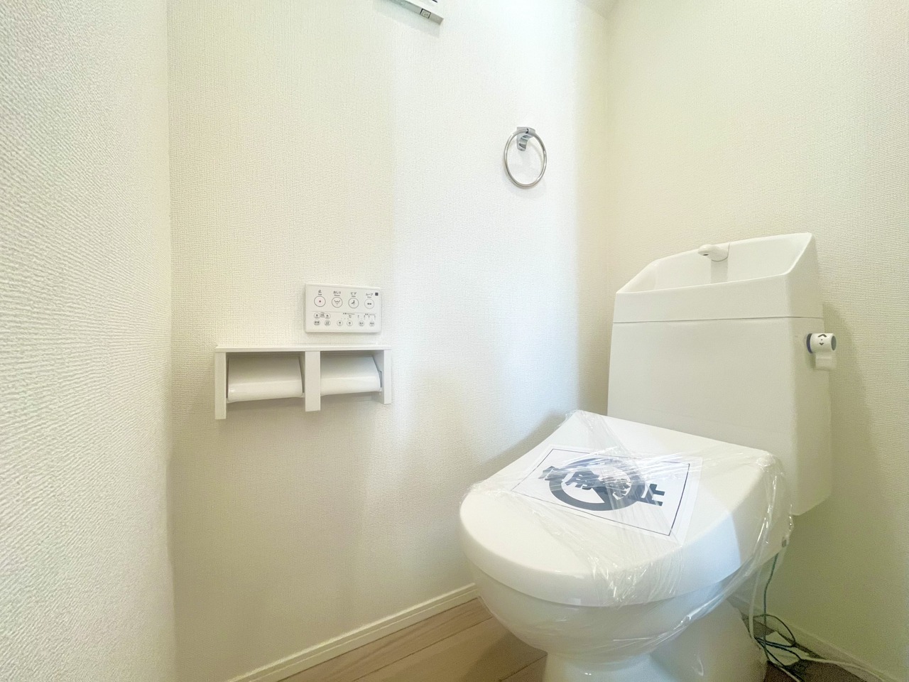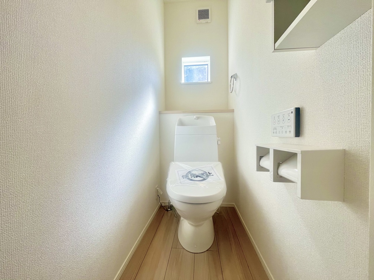 ウォシュレット機能付きのトイレ。換気のしやすい窓付きで、収納もあり実用性も兼ね備えた造り。