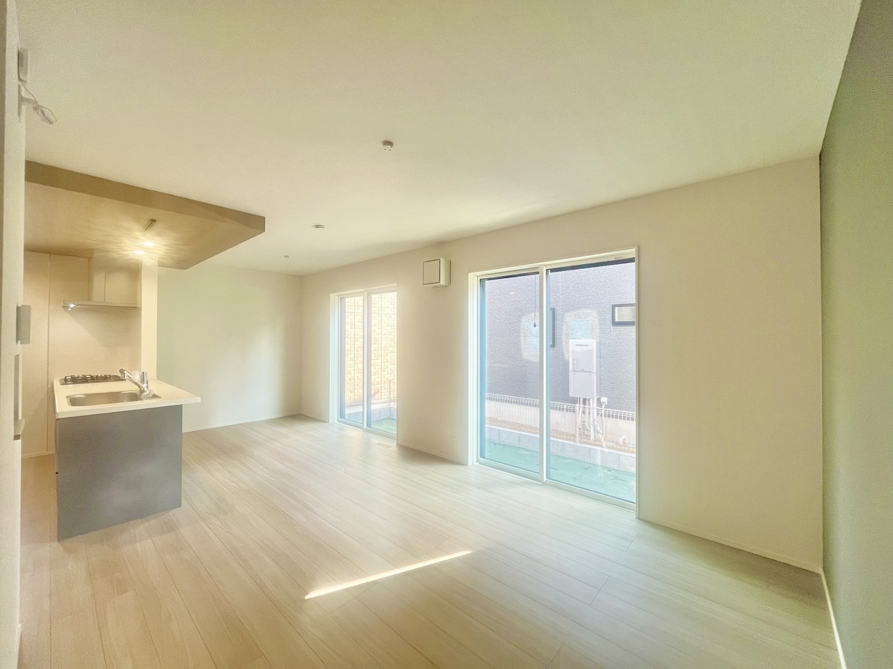 大きな開口部から明るい光が差し込む、日中の室内の明るさがこの部屋の魅力です。