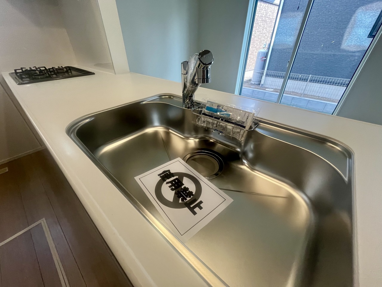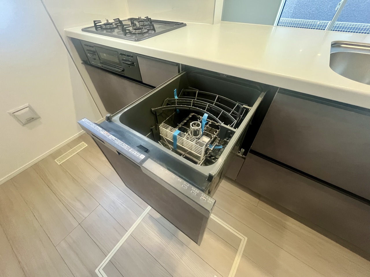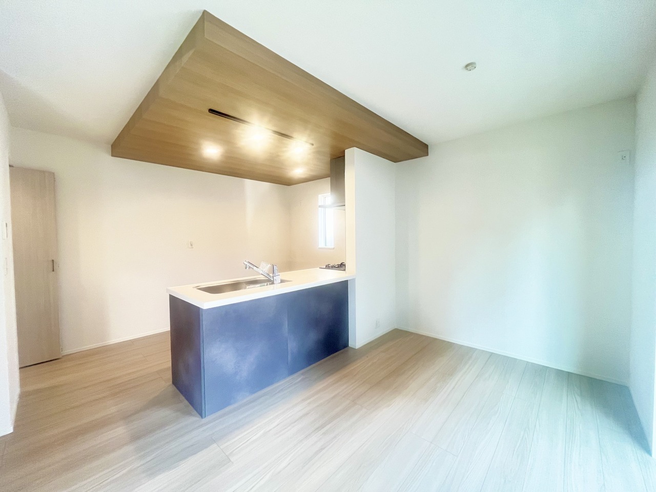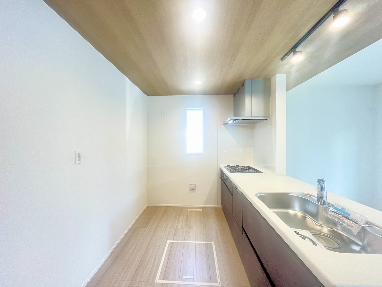 リビングにいる家族の顔が見渡せるカウンターキッチン。お料理もより一層おいしく、楽しく。食器棚を背面に設置しても十分な広さを確保しています。