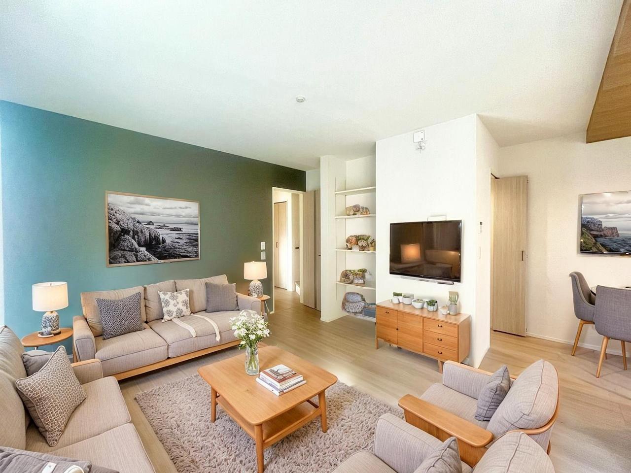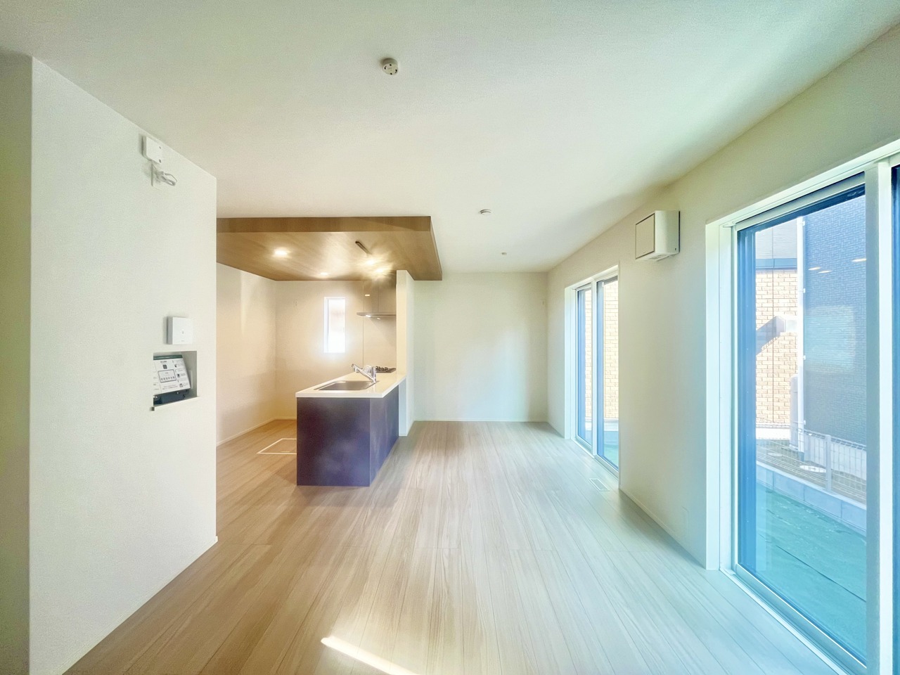 家族や友人、両親、親戚とこれから沢山の時間を紡ぐのだろう。そこを彩るのは窓から見える青い空、心地よい緑。そんなイメージが膨らむリビングスペース。