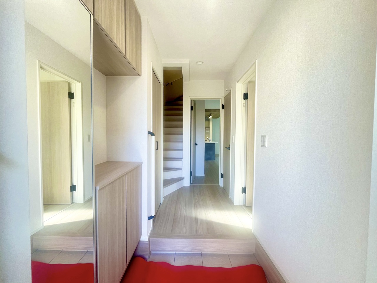 お宅の顔となる明るく開放的な玄関。ご家族皆様様の靴を収納できるスペースと全身鏡があり、お出掛け前に身だしなみチェックもできます。