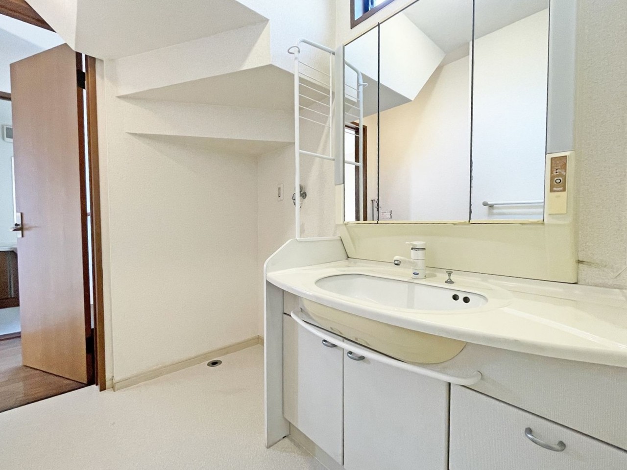三面鏡にハンドシャワー付き、 使いやすい洗面台。