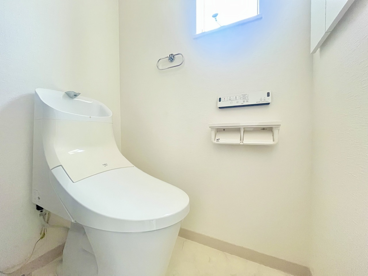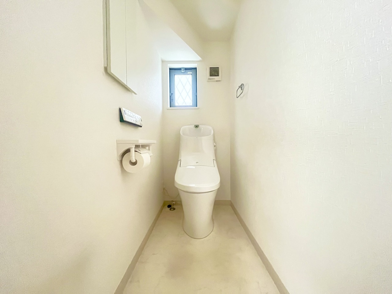 ウォシュレット機能付きのトイレ。換気のしやすい窓付きで、収納もあり実用性も兼ね備えた造り。
