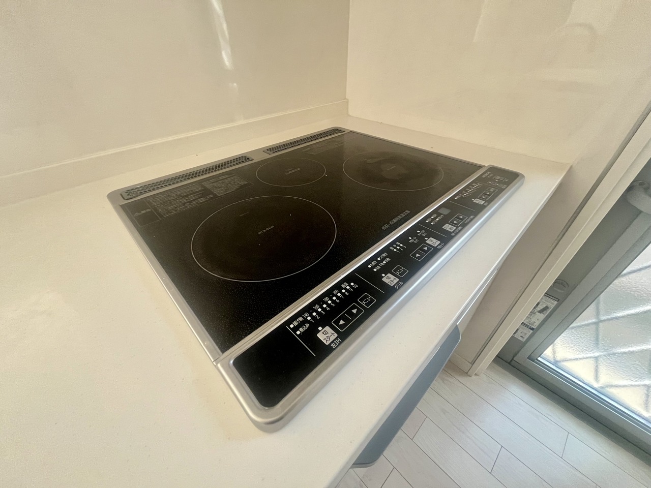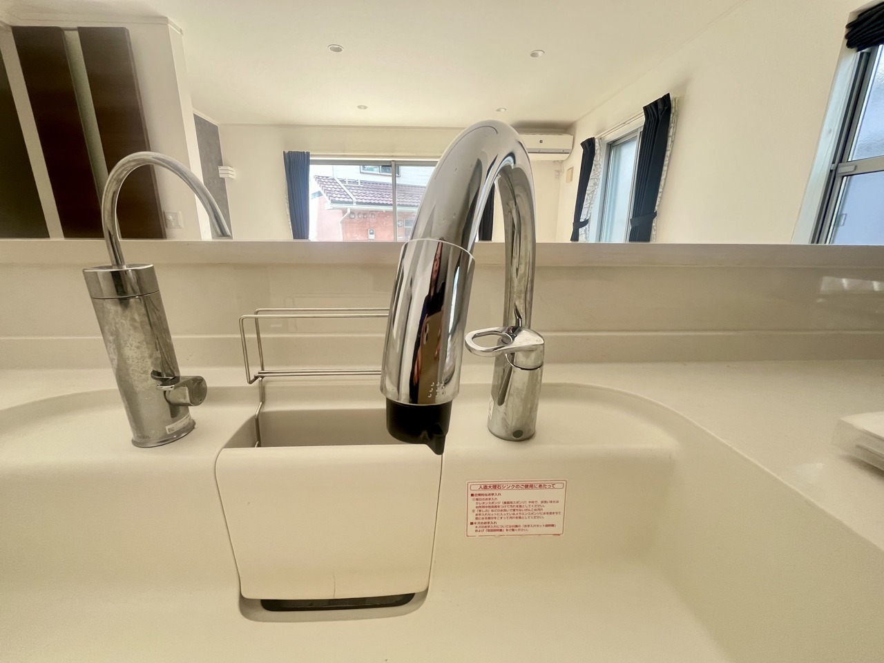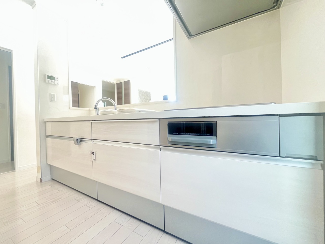 収納量豊富なシステムキッチン。明るい光が差し込む窓も調味料置き場などに役立ちます。カウンターキッチンと違い、背面を広く使えるので自由度が高いのも嬉しいですね。