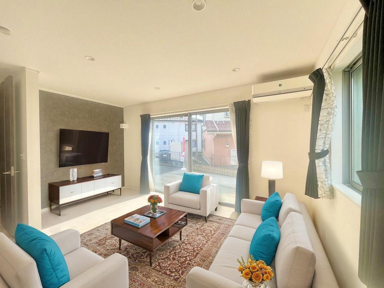 家族や友人、両親、親戚とこれから沢山の時間を紡ぐのだろう。そこを彩るのは窓から見える青い空、心地よい緑。そんなイメージが膨らむリビングスペース。