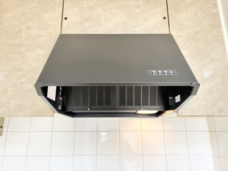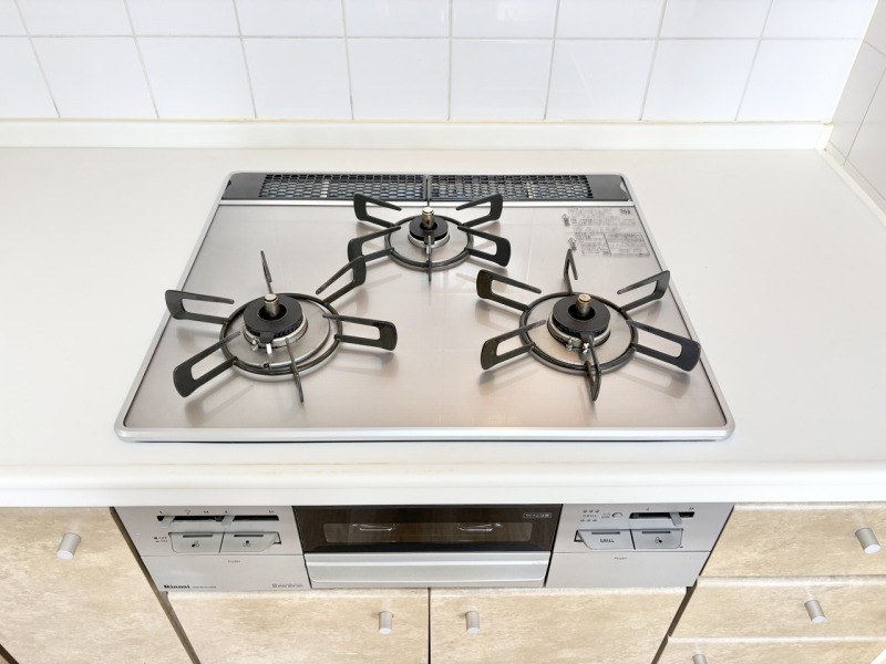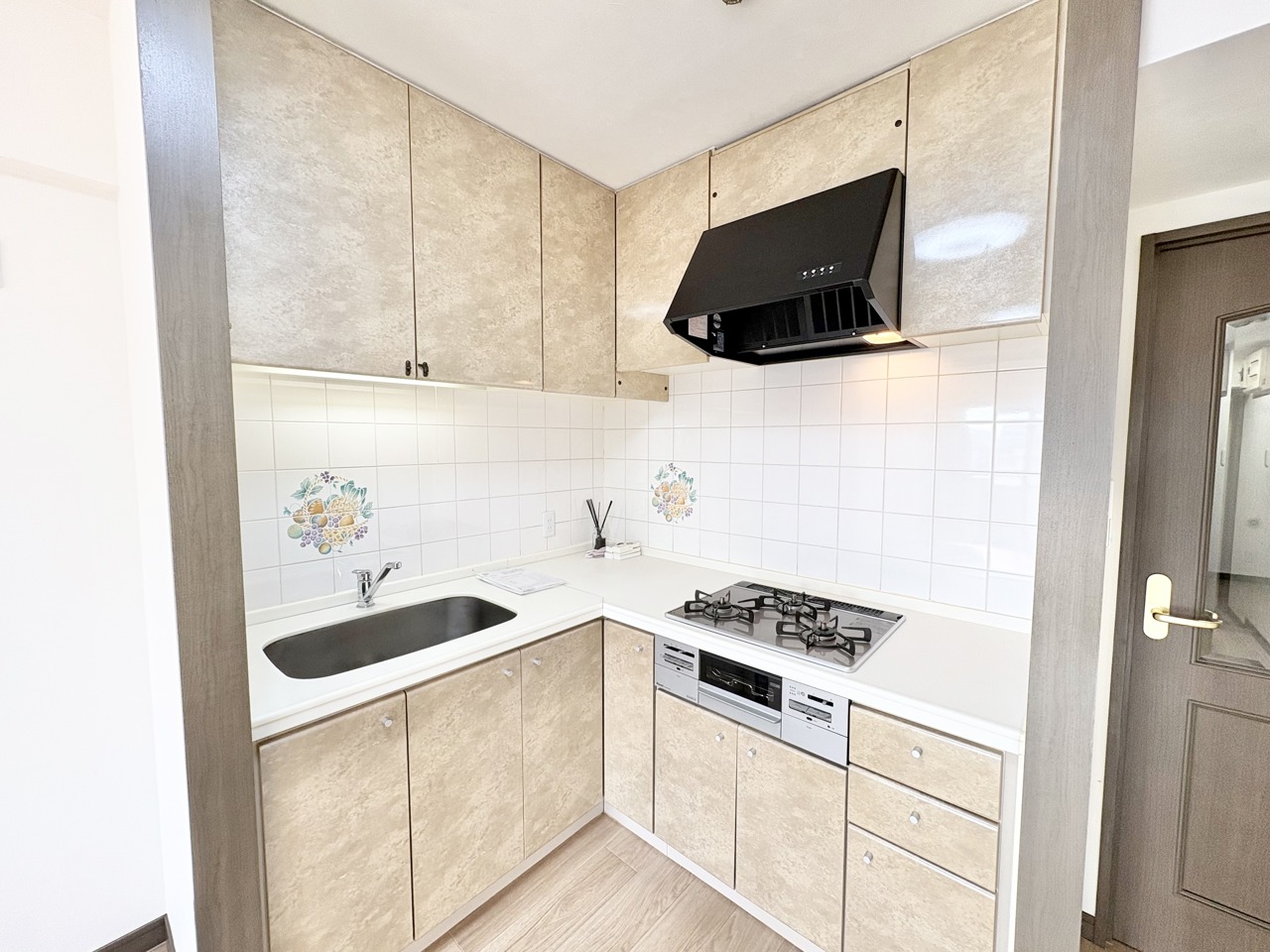 清潔感のある白タイルと木目調の収納が調和した、機能的なキッチン空間