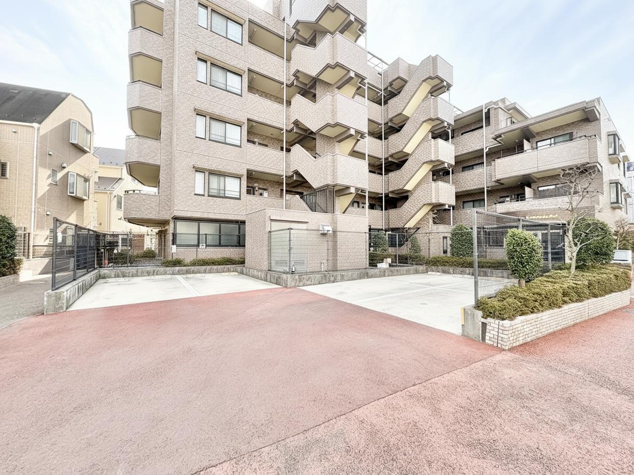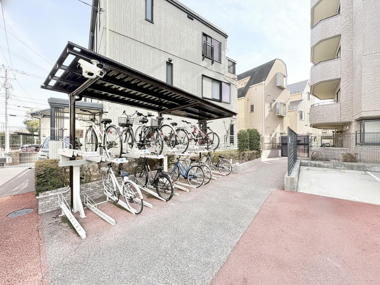 青空の下、自転車が整然と並ぶ、安心感のある住まい。