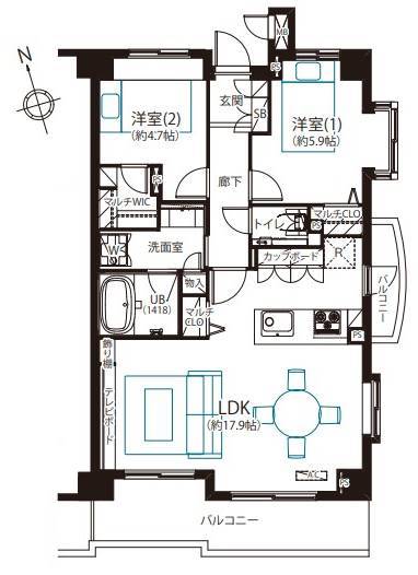 | 間取 | 2LDK (LDK17.9帖、洋室5.9帖、洋室4.7帖) | ||