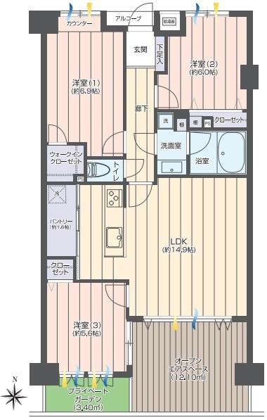 | 間取 | 3LDK (LDK14.9帖、洋室6.9帖、洋室6.0帖、洋室5.6帖) | ||