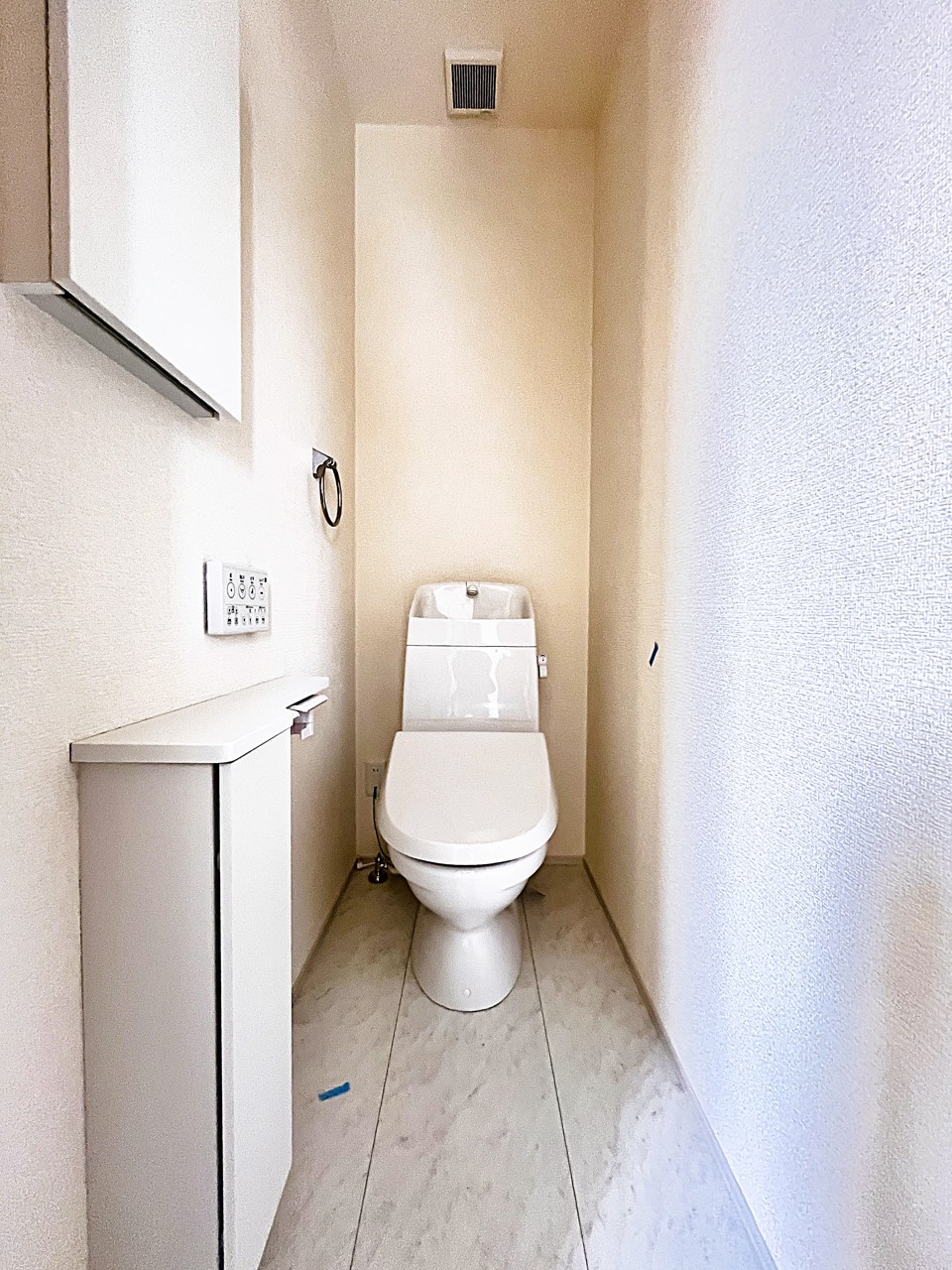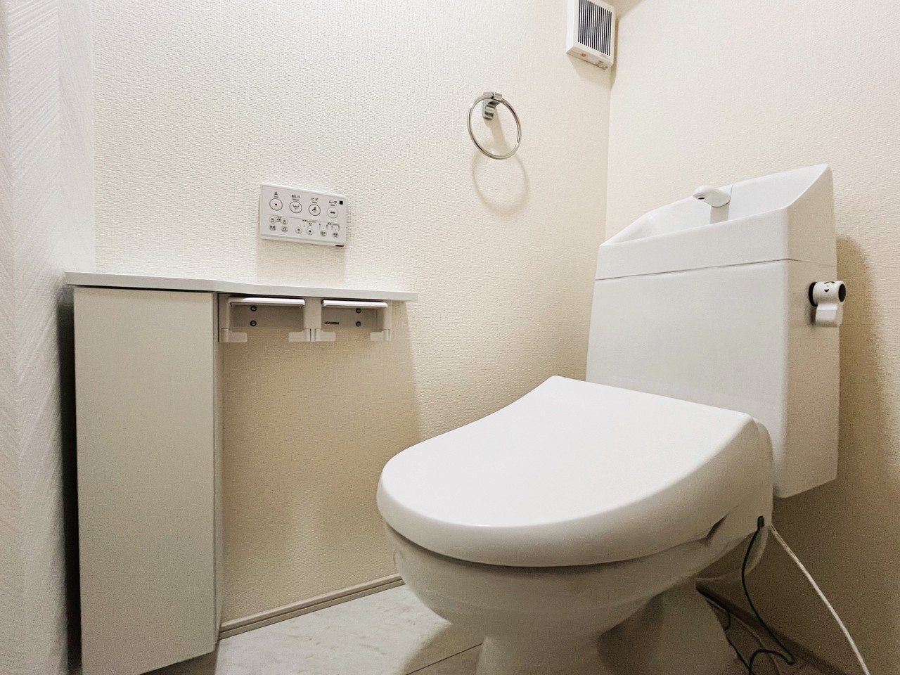 ウォシュレット機能付きのトイレ。収納もあり実用性も兼ね備えた造り。