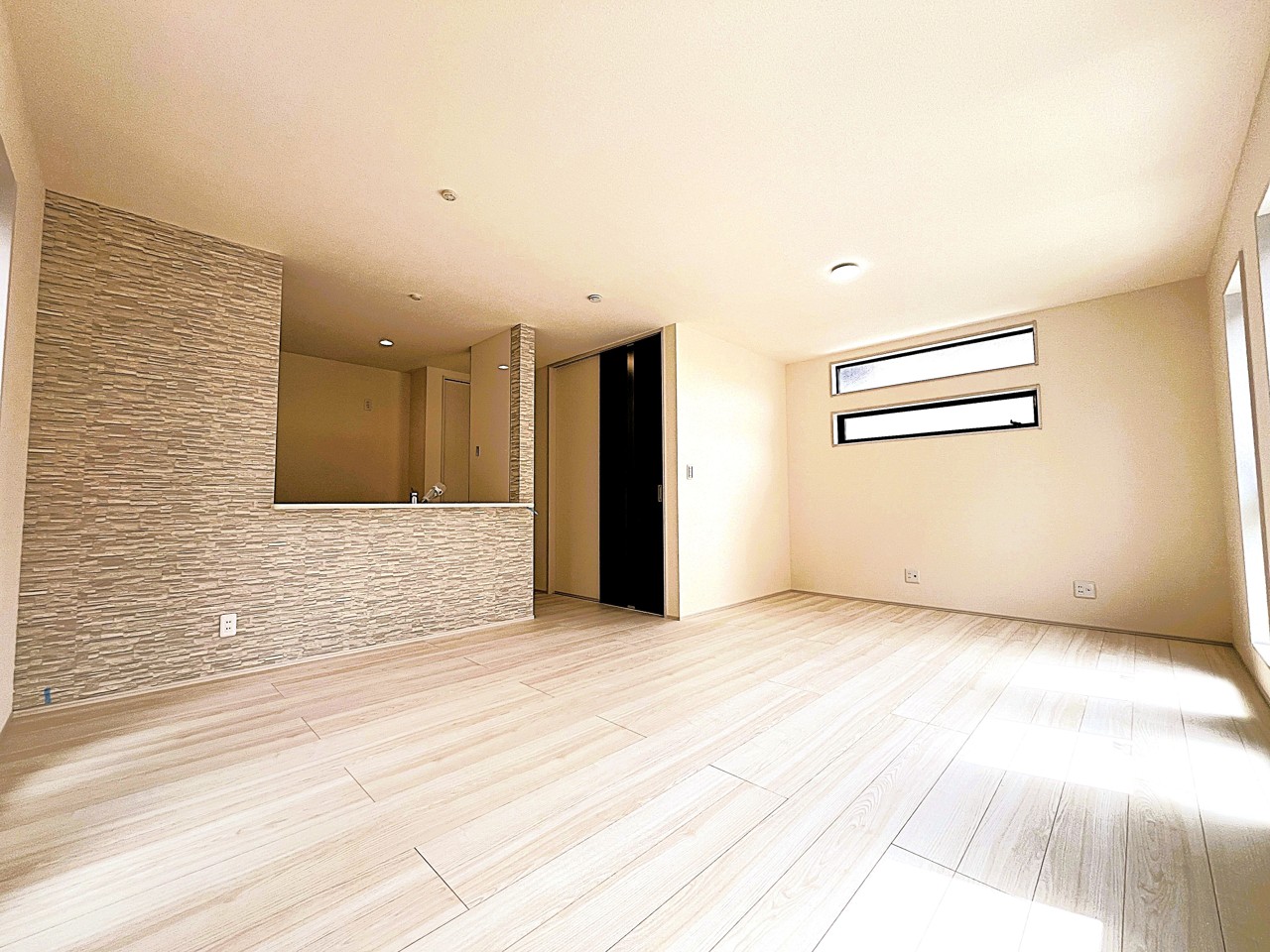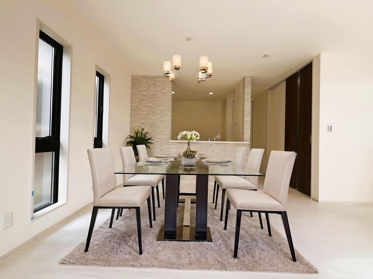 家族や友人、両親、親戚とこれから沢山の時間を紡ぐのだろう。そこを彩るのは窓から見える青い空、心地よい緑。そんなイメージが膨らむリビングスペース。