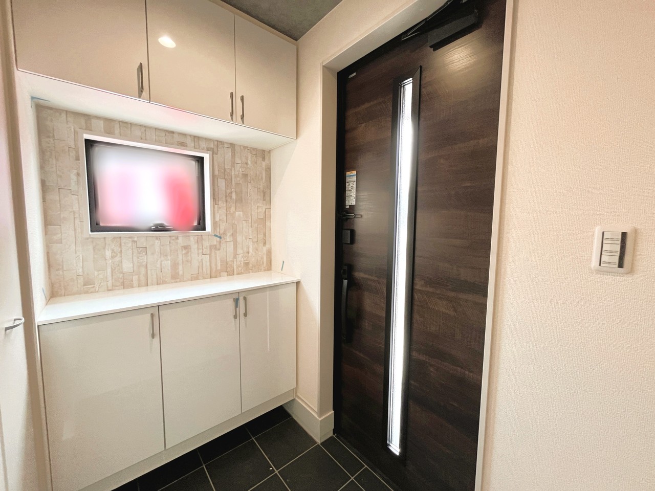 明るく開放的な玄関、靴の脱ぎ履きもしやすく、玄関から続く土間収納は可動棚が豊富でご家族皆様の靴などをスッキリ収納できます。