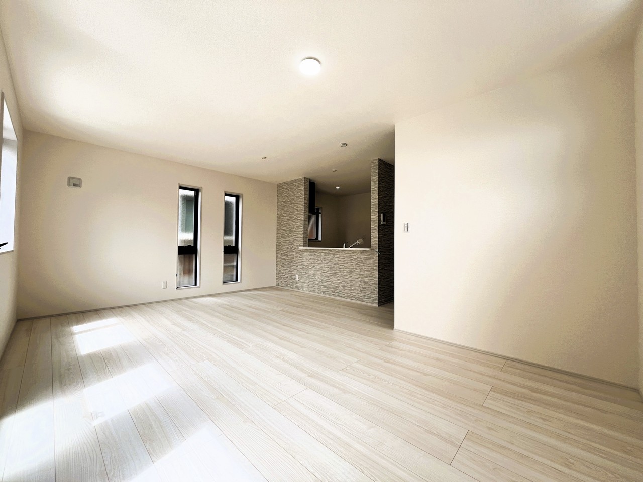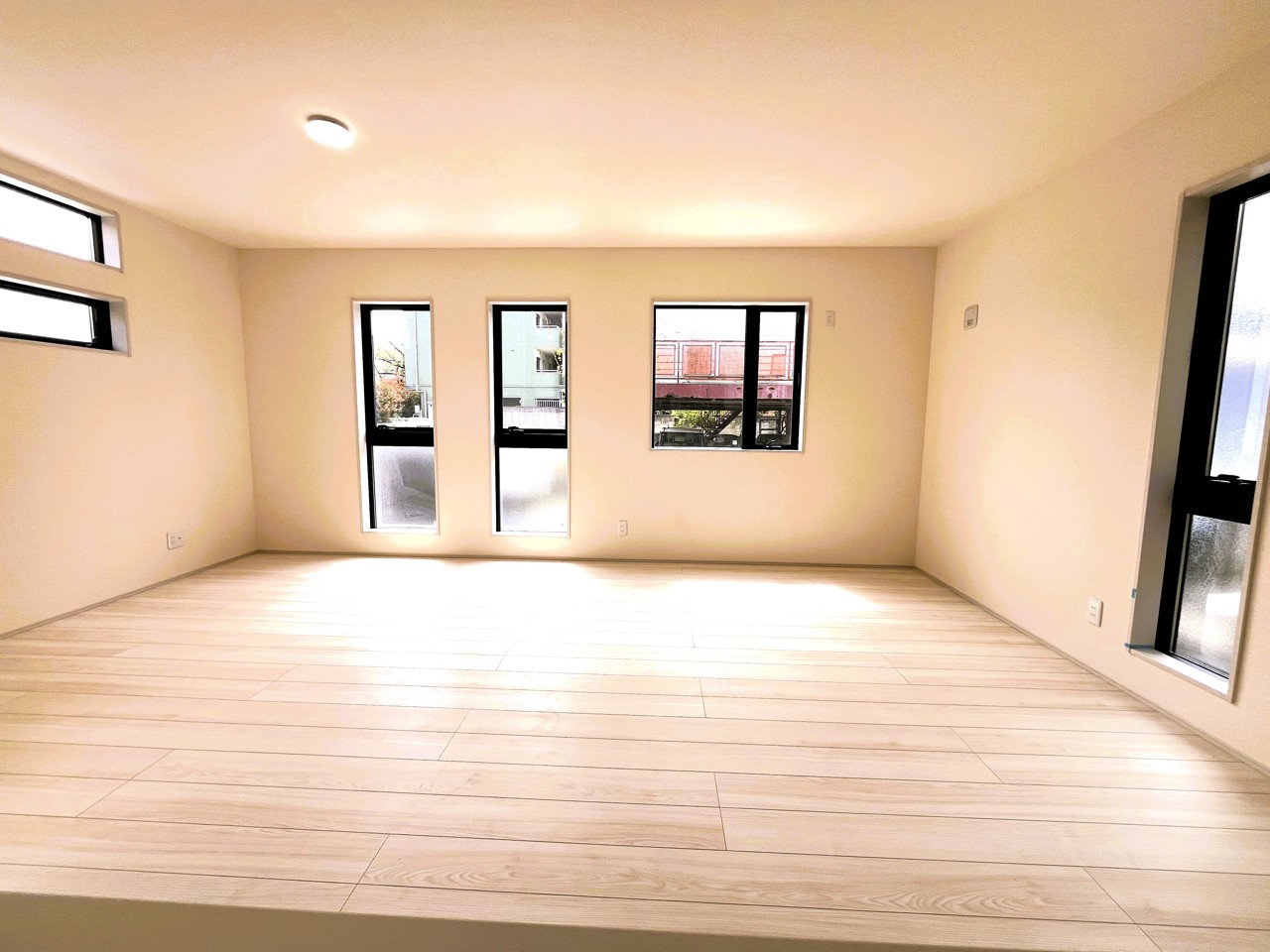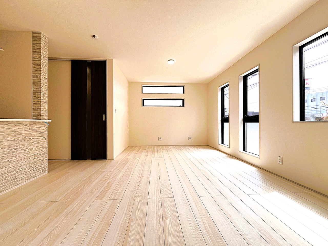 床暖房がある明るいリビングは、より多くの光を室内に取り入れるよう考えられた設計士の心遣いが感じられる窓の配置。家族団欒の場所になりそうです。