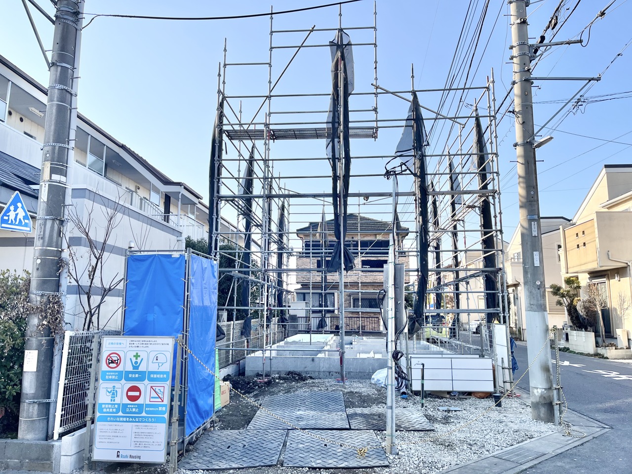 青空の下、清々しい空気が心地よい建築現場