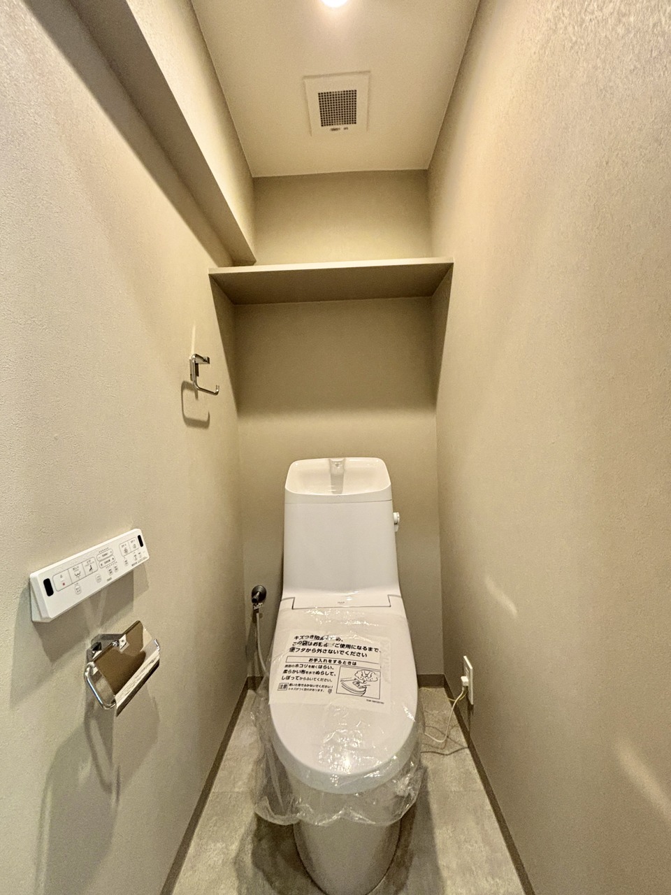 ウォシュレット機能付きのトイレ。収納もあり実用性も兼ね備えた造り。