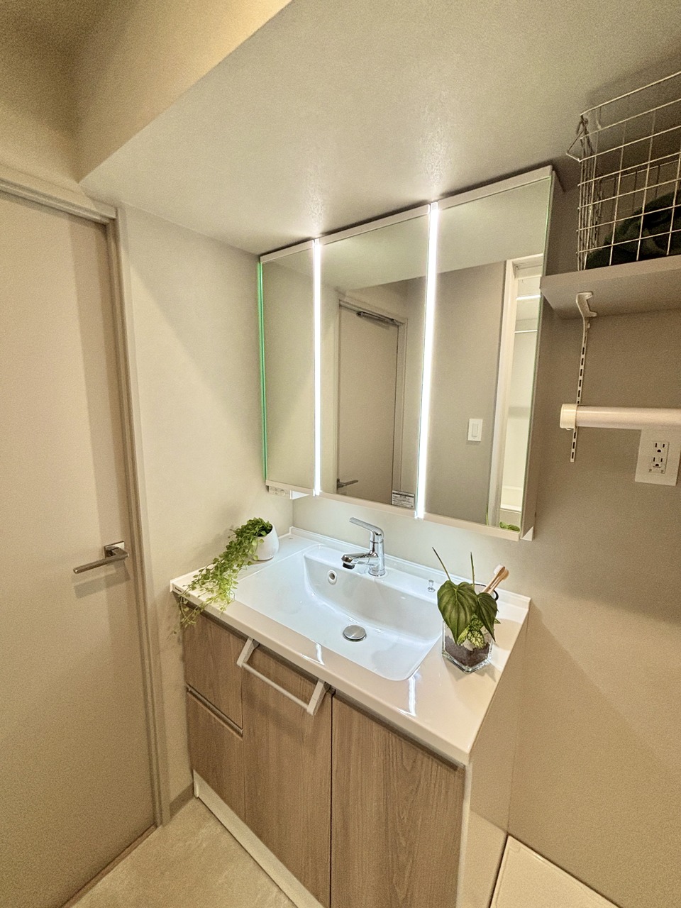 お出かけ前の身だしなみに一歩差がつく三面鏡。ミラー裏にはたっぷり収納もございます。