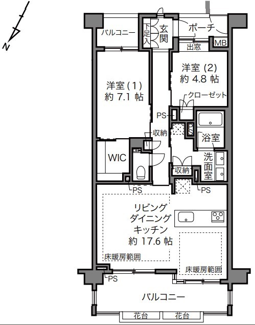 | 間取 | 2LDK (LDK17.6帖、洋室7.1帖、洋室4.8帖) | ||