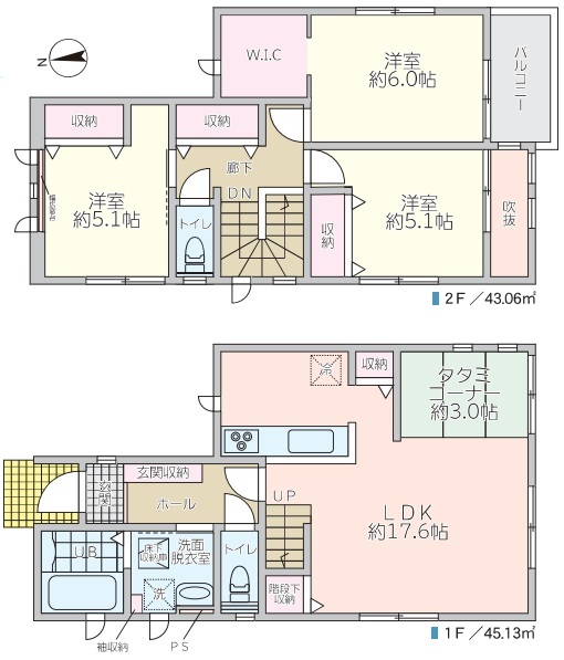 | 間取 | 3LDK + タタミコーナー約3.0帖 (LDK17.6帖、洋室6.0帖、洋室5.1帖、洋室5.1帖) | ||