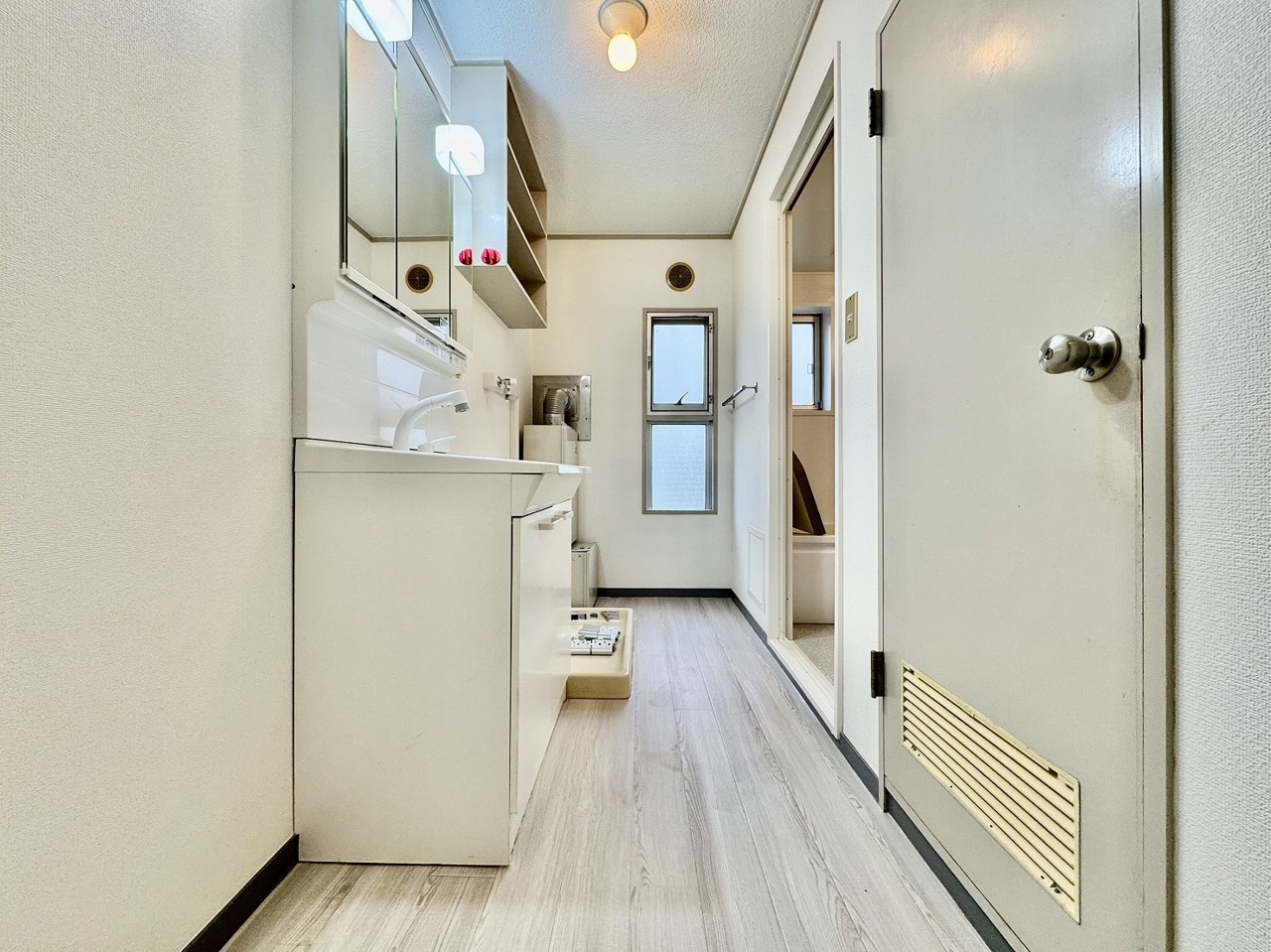 三面鏡にハンドシャワー付き、 使いやすい洗面台。