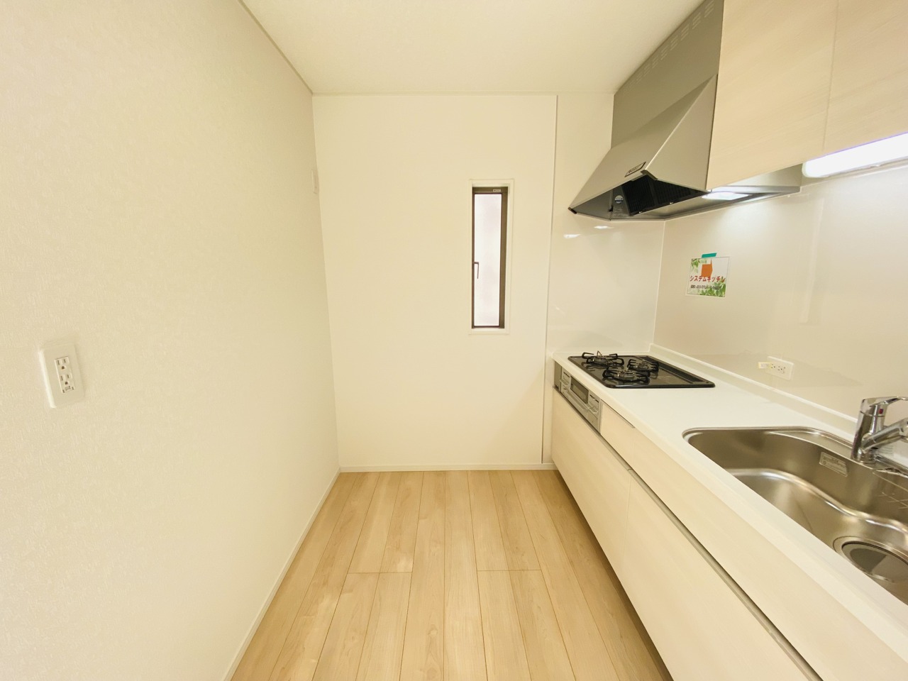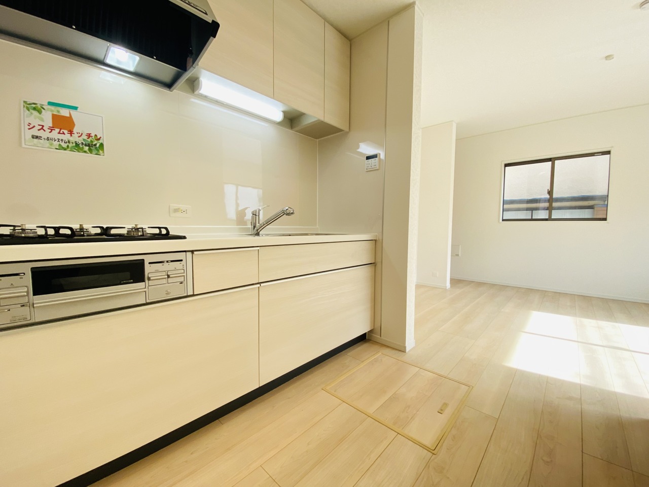収納量豊富なシステムキッチン。明るい光が差し込む窓も調味料置き場などに役立ちます。カウンターキッチンと違い、背面を広く使えるので自由度が高いのも嬉しいですね。