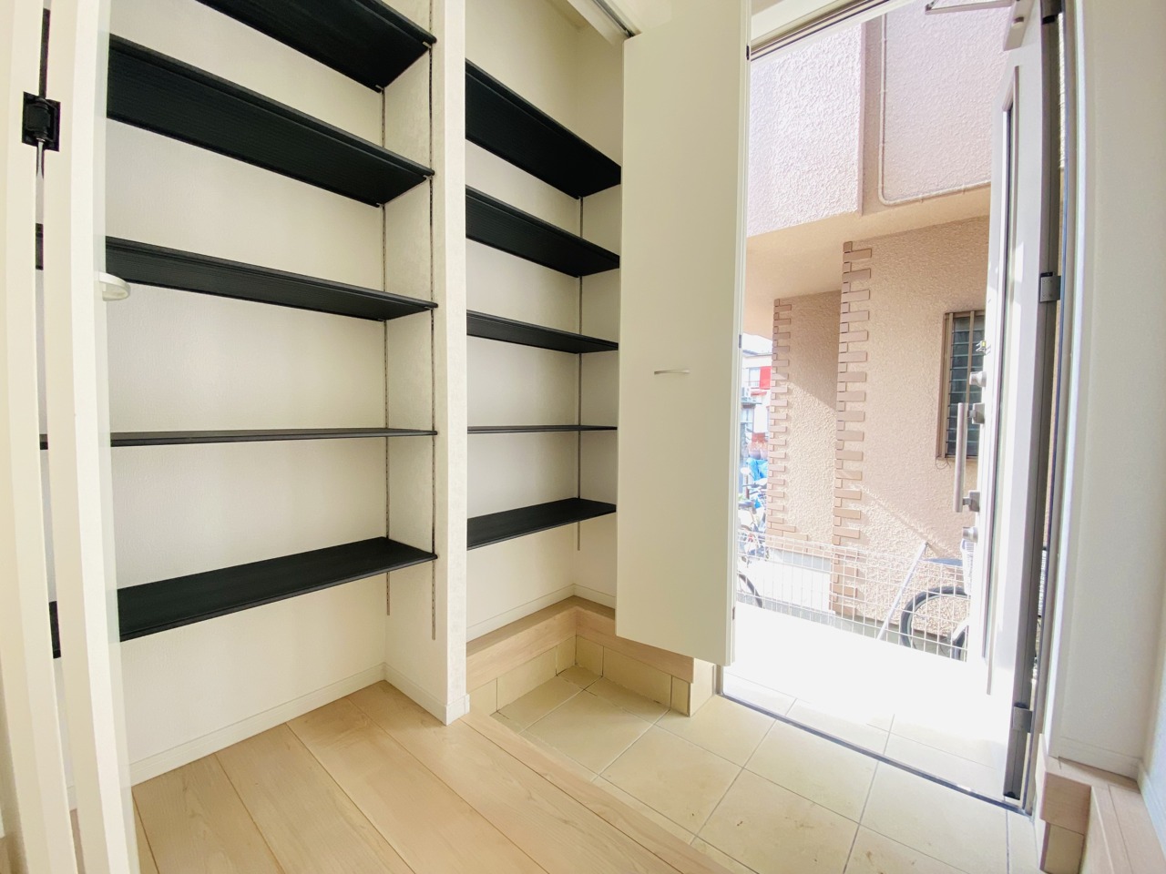 明るく開放的な玄関、靴の脱ぎ履きもしやすく、収納も豊富でご家族皆様の靴をスッキリ収納できます。