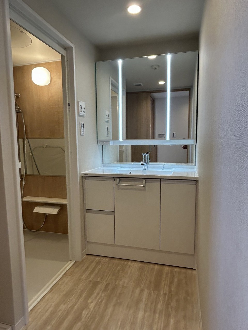 収納豊富な三面鏡付洗面化粧台。水回りのあれこれがキレイに収まりそうですね。